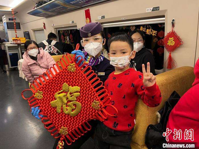 “我是湖南长沙人,目前在广州工作,因为疫情的原因,有两年没回老家过年了,今天领着老婆和孩子回长沙看爷爷奶奶,一上车,看到列车满是窗花、中国结、福字,感觉年马上就要到了,特别有过年的气氛。”旅客李先生说。