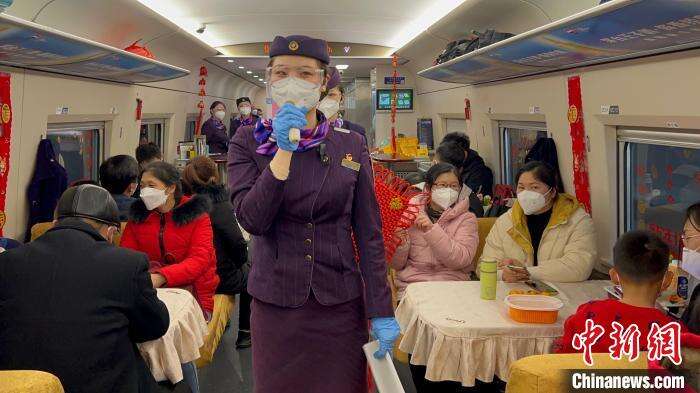 11时52分,郴州西站开车后,随着列车长刘豪向旅客们致以新春的问候,活动就此拉开序幕。在高铁上,乘务员们为旅客精心准备了歌曲、猜谜语等活动,同时还给旅客免费提供了热腾腾的饺子、甜甜的砂糖橘等食物,让旅途充满了暖意。