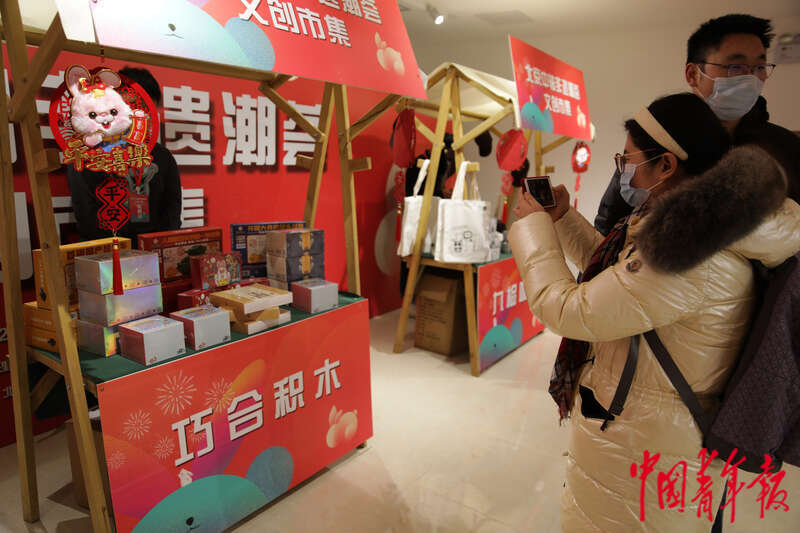 1月19日,北京前门大栅栏,参观者在一处文创市集展台前拍摄。中青报·中青网记者 陈剑/摄
