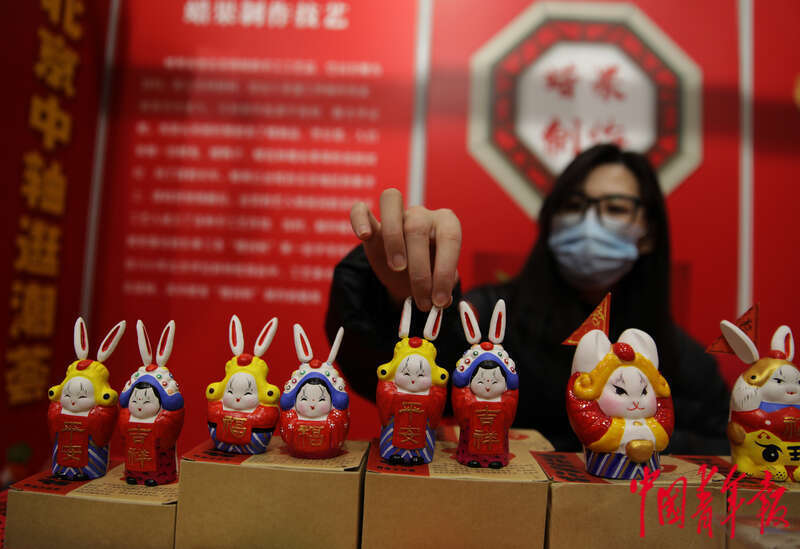 1月19日,北京前门大栅栏,一位年轻的手艺人在展台上展示蜡果制作的兔爷。中青报·中青网记者 陈剑/摄