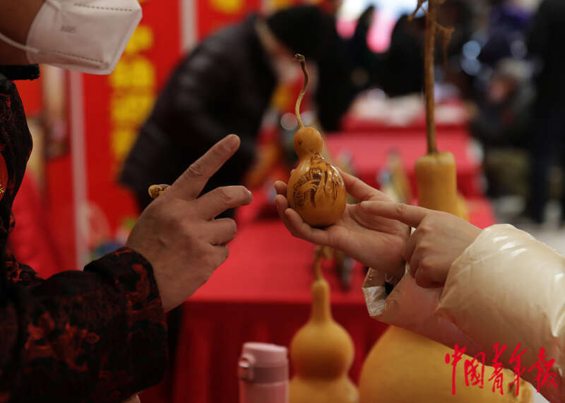 1月19日,北京前门大栅栏,一位老手艺人给参观者介绍通过北京“葫芦烙”绘制的关公。中青报·中青网记者 陈剑/摄