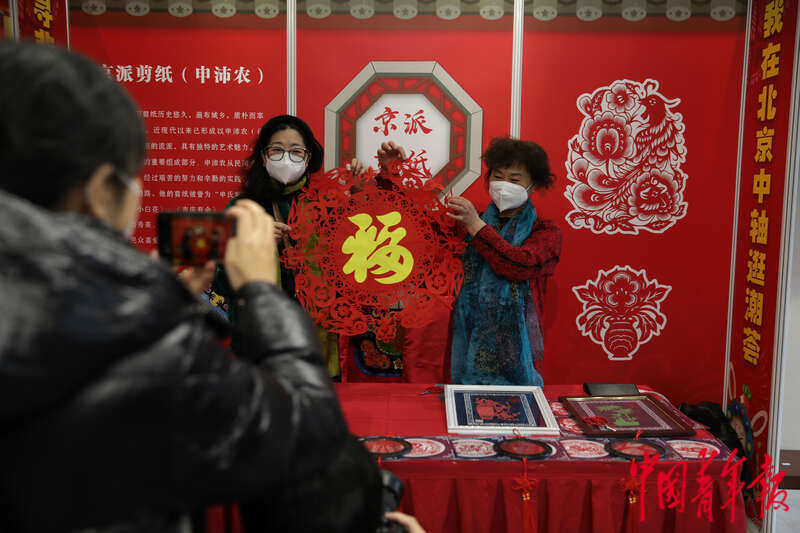 1月19日,北京前门大栅栏,参观者在京派剪纸的展台前拍照。中青报·中青网记者 陈剑/摄