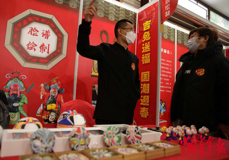 1月19日,北京前门大栅栏,脸谱绘制的展台前,参观者与年轻的非遗传承人(左)交流。中青报·中青网记者 陈剑/摄