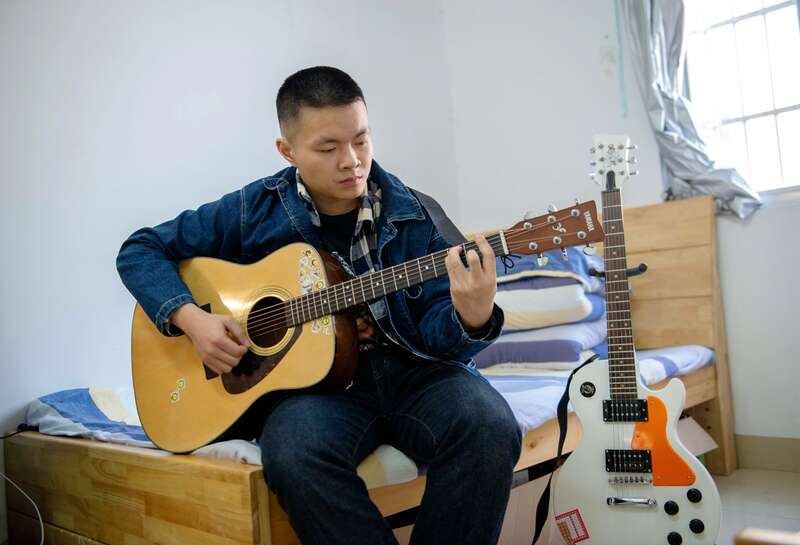 罗士麒从小喜爱音乐,入警第一年,他攒钱买下一把民谣吉他,并跟着网上的视频教程自学音乐。每天下班回到宿舍,他都会抱着吉他,沉浸在音乐世界中。经过一年多的练习,罗士麒的指尖结出了老茧,如今他已经可以边弹边唱、改编填词。