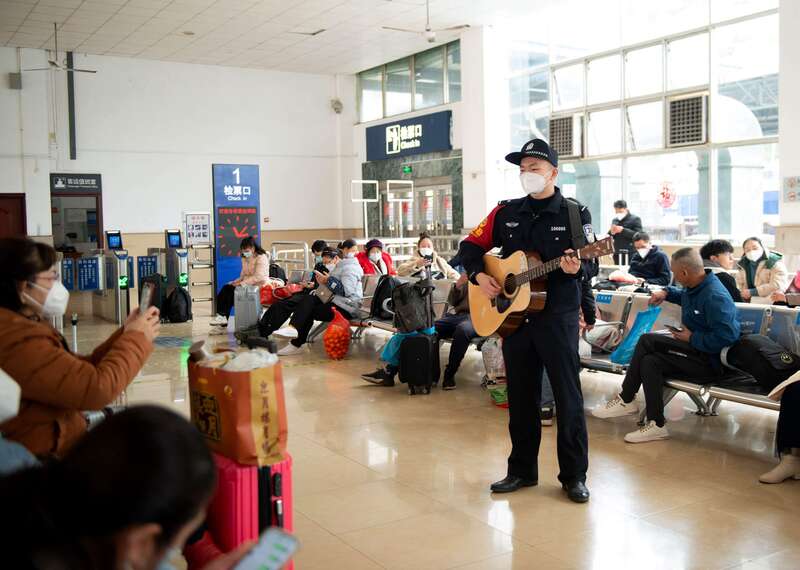1月18日下午,在广西河池市金城江火车站候车室内,曲调悠扬的歌声吸引了正在候车的旅客驻足聆听。南宁铁路公安局柳州公安处金城江站派出所(以下简称金城江站派出所)民警罗士麒正在演唱自己改编填词的春运反电诈版歌曲《有何不可》,并向旅客发放原创的反电诈漫画。