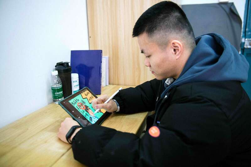 罗士麒在宿舍创作反电诈漫画。胡玄德/摄