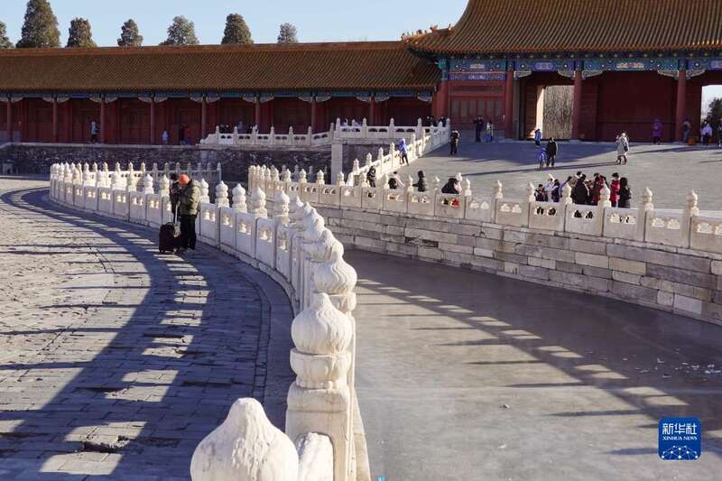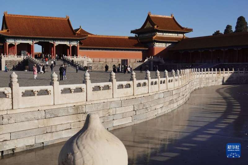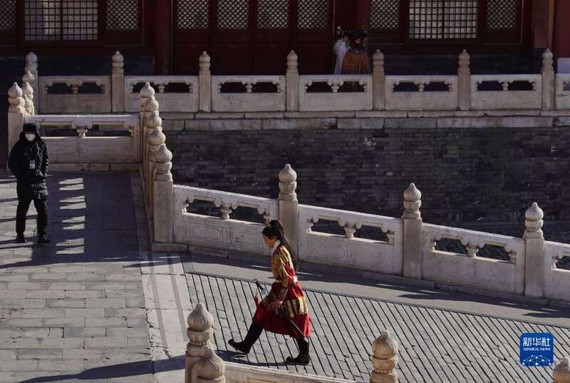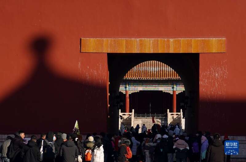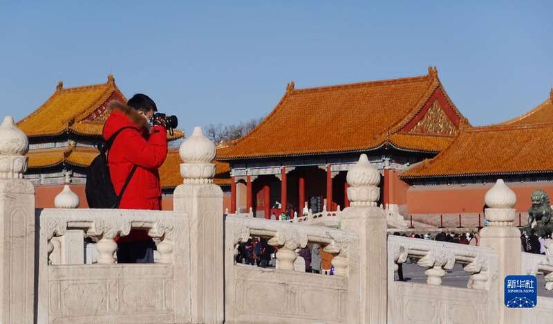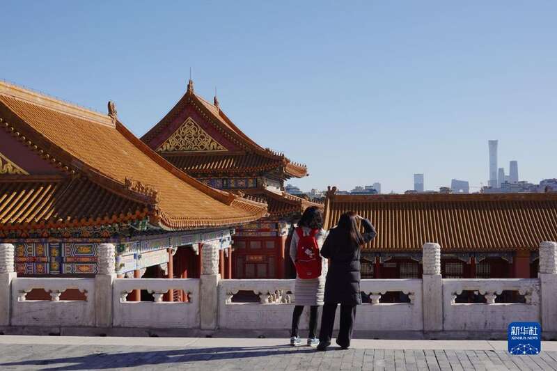 春节前夕,不少游人来到北京故宫博物院,在蓝天暖阳下感受冬日故宫的独特韵味。