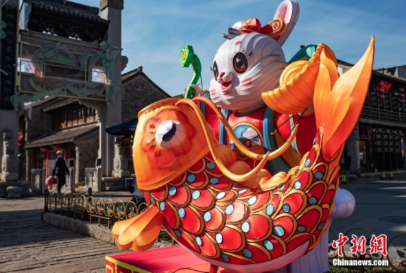 江苏南京,街头布置的兔年彩灯增添喜庆气氛。为迎接农历兔年,南京城南夫子庙、门东老街、明城墙开始布置各式彩灯。 中新社记者 泱波 摄