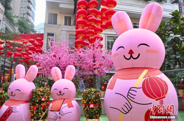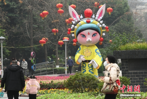 重庆街头兔年新春装置营造喜庆氛围。 中新社记者 陈超 摄