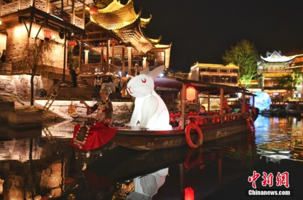 湖南凤凰古城内的沱江泛舟兔花灯亮灯,游人乘船赏花灯感受年味。 中新社记者 杨华峰 摄