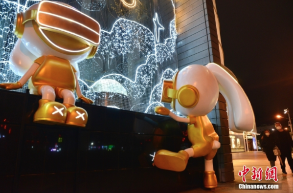 陕西西安,一大型商场外摆放着“长安兔”。随着农历新年的临近,西安各商家开始“装扮”迎新年。 中新社记者 张远 摄