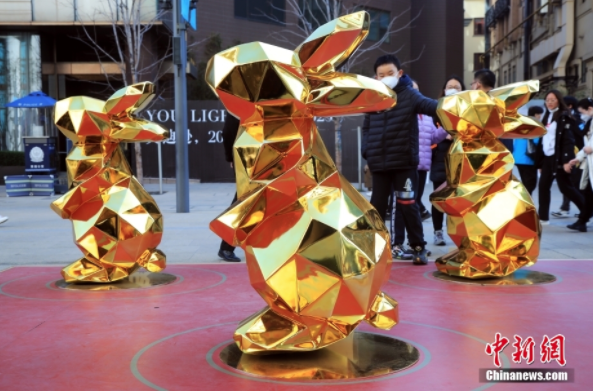 上海街头可爱的“金兔”吸引了不少路人的目光。 中新社记者 汤彦俊 摄
