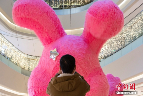 北京市朝阳区一家商场内,一只从天而降的粉红色巨型萌“兔”成为市民“打卡”的热门地点。 中新社记者 侯宇 摄