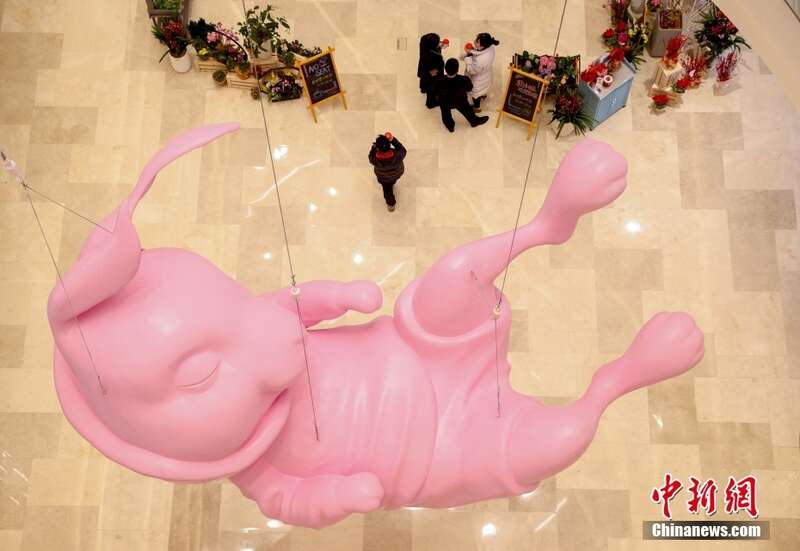 湖北武汉,一组粉色兔子的艺术装饰品亮相武商Mall·国广内,让顾客在购物的同时感受艺术装饰的魅力。中新社记者 张畅 摄