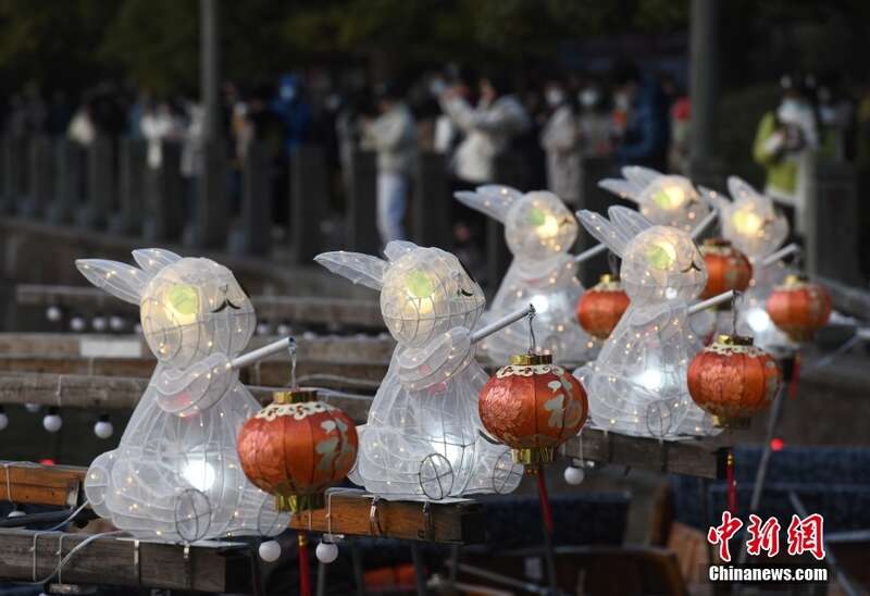 30条以兔子花灯装饰的“福气”游船亮相浙江杭州西湖,浓浓年味吸引游客。 中新社记者 王刚 摄