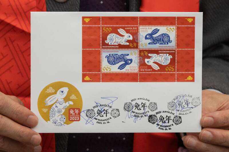 匈牙利发行的兔年生肖邮票由该国艺术家毛罗什·克里斯蒂娜设计,采用四角对称构图,以红白两色为背景,描绘了与青花瓷同色调的两对小兔子,并以中匈两国文字标识出“兔年”主题。