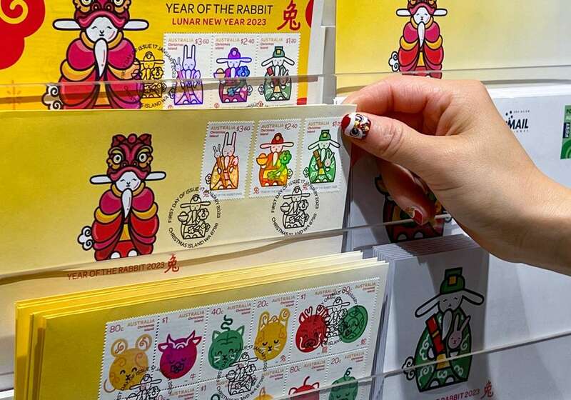 澳大利亚发行的兔年生肖邮票1套3枚,每枚以白色为底,上面各有一只宽袍大袖的卡通兔,分别代表福、禄、寿三星。邮票上还点缀有元宝、祥云、寿桃、如意等喜庆吉祥的中国传统文化元素。