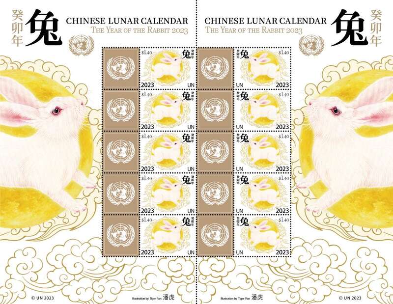 联合国邮政管理局1月20日在纽约发行中国农历癸卯兔年特别版邮票版张,庆祝中国农历新年的到来。版张由每枚面值1.40美元的10枚邮票组成,邮票左半部分为联合国会徽图案,右半部分为中国设计师潘虎创作的工笔画“月兔”图,背景是祥云围绕的金色月亮。