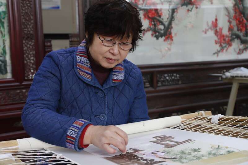 后来,程曼萍如愿留在刺绣车间,开始了逐梦生涯。两年以后,因为刺绣技艺扎实,还在学徒期的程曼萍被破格选入《清明上河图》绣制小组,参与绣制基础针法部分。“我不是有天赋的人,只能特别努力。”程曼萍说道。被选入绣制小组后,程曼萍给自己制定了“加练”计划,白天在厂里绣制《清明上河图》的基础针法,晚上回去加练复杂针法到深夜。