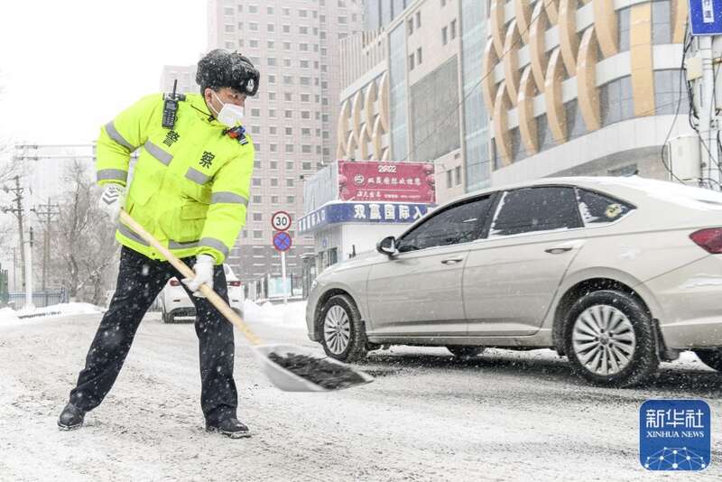 1月21日,在位于乌鲁木齐市的北园春副食海鲜市场附近,民警阿拉法特·胡加何买提在路面上抛洒炉渣,以防车辆打滑。新华社记者 王菲 摄