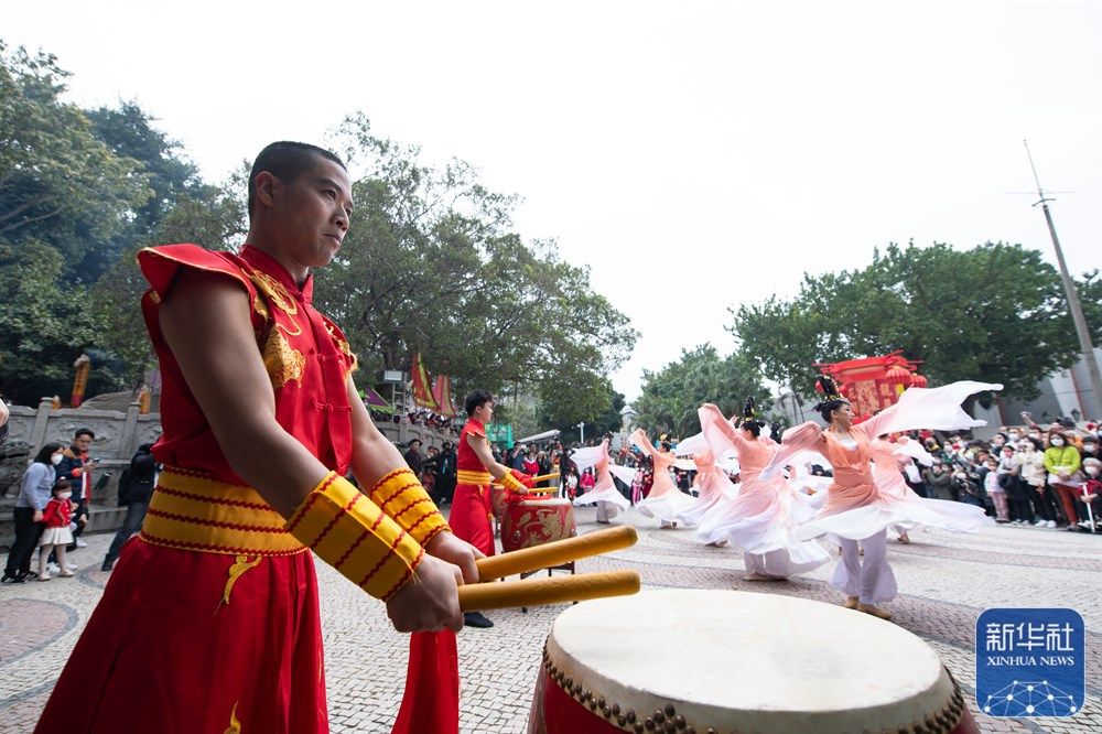 1月23日,演员在澳门妈阁庙前表演鼓乐舞。新华社记者 张金加 摄