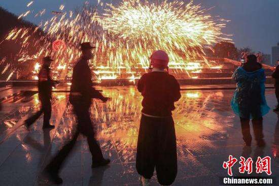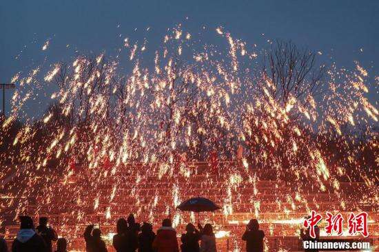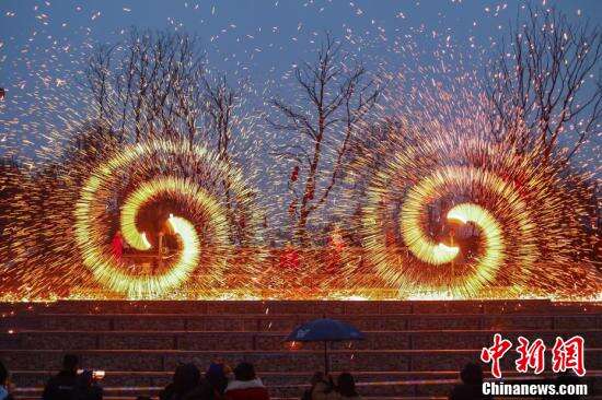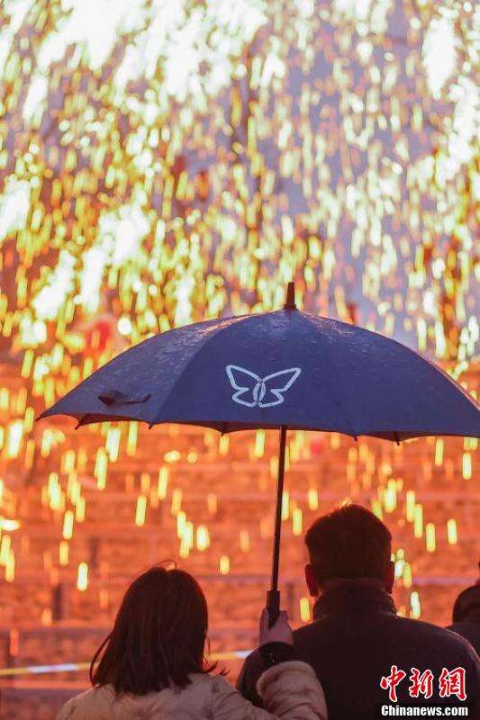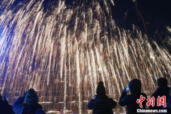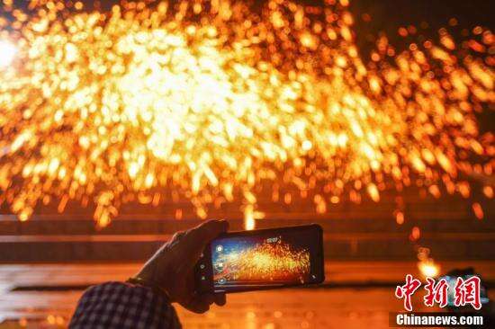 1月23日晚,江苏盱眙,国家级非物质文化遗产打铁花上演。春节期间,千年古城江苏盱眙第一山历史文化街区举办“逛第一山古城 品老街味道”系列文旅活动,热闹的舞龙舞狮、丰富的当地美食、各种形式的表演,绘就出一幅幅“年味儿”十足的新春画卷。
