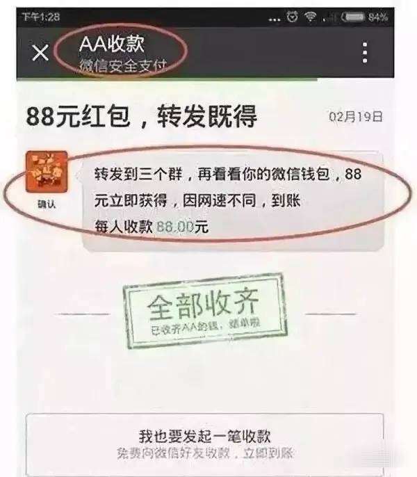 警惕写着“送钱”“现金礼包”“AA红包”等字样的红包骗局。此类红包往往对微信AA收款界面进行略微改动,加上“送钱”“现金礼包”等字样,让用户误以为输入密码是在领红包,但实际上却是给对方转账 。