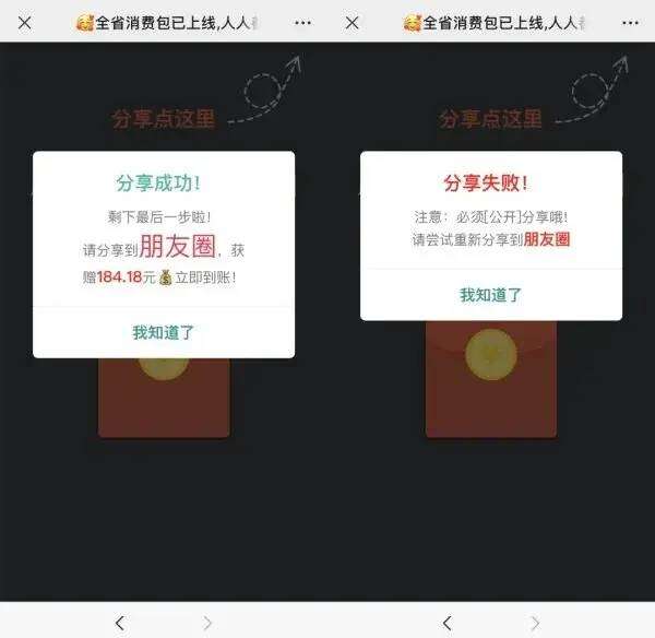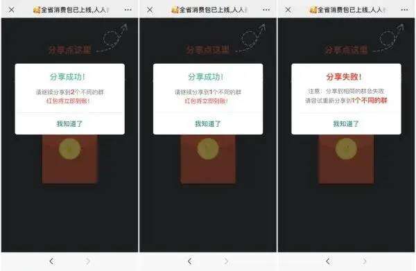 在点击此类红包后,页面提示需要转到其他微信群或分享到朋友圈才能领取。利用微信好友链进行传播,让用户大大降低了警惕,很多人出于对好友的信任,点击后继续分享给其他好友。加上红包流程繁琐,让很多人不愿意“前功尽弃”,造成恶性循环,传播量极广。