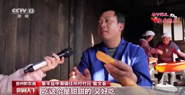 贵州黔东南黎平县中潮镇佳所村村民 詹文春:侗果是我们侗族的一种特色的传统美食,也是年货,像过年时候去走村串寨,去做客,都要手提一两包侗果去串门。吃这个是甜甜的,又好吃,就寓意着我们的生活甜甜蜜蜜。希望2023年我们的侗果生意越做越大,让全国观众人民都知道我们贵州黎平佳所的侗果。