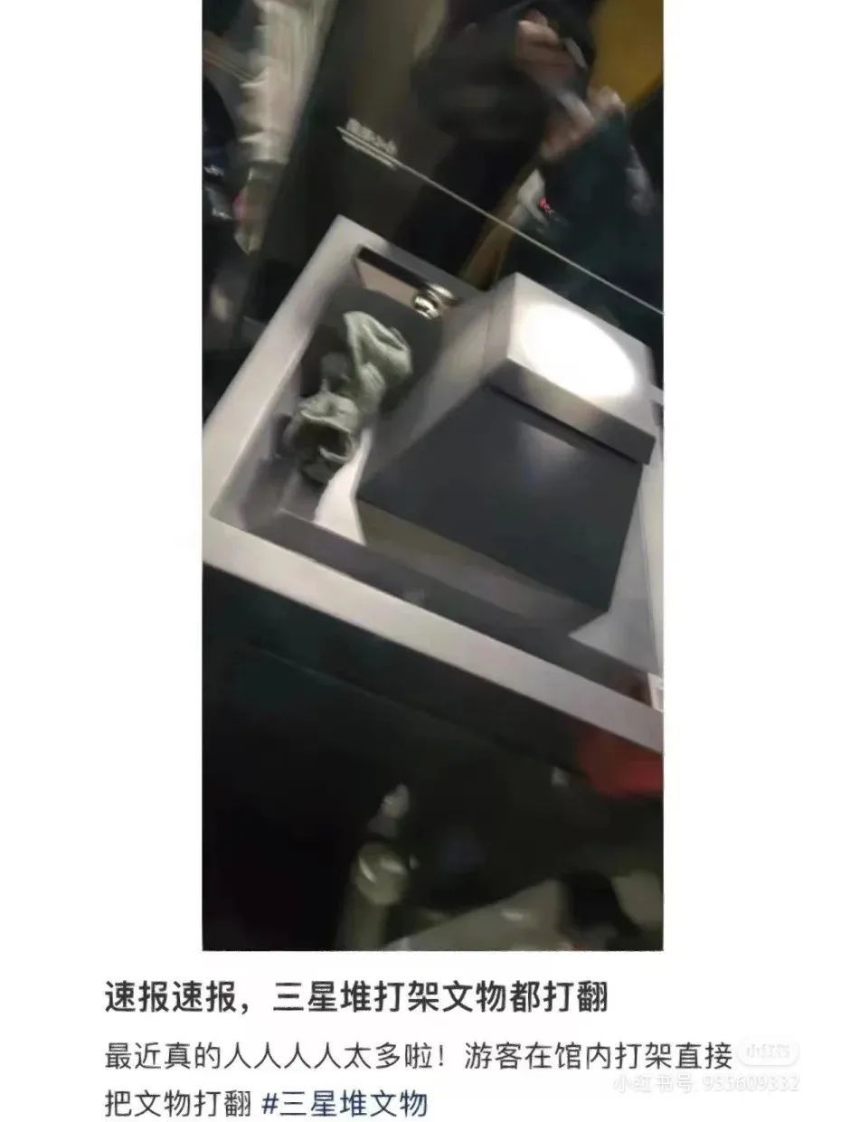 1月25日,有网友在社交平台发文:“春节来三星堆的人太多了……游客挤着挤着就打起来了,把铜跪人像都打翻了,建议想慢慢看的可以选择平时错峰来”。在配图中,能看到本该立在文物展示柜中间的青铜人像,翻倒在展示台与玻璃罩中间。