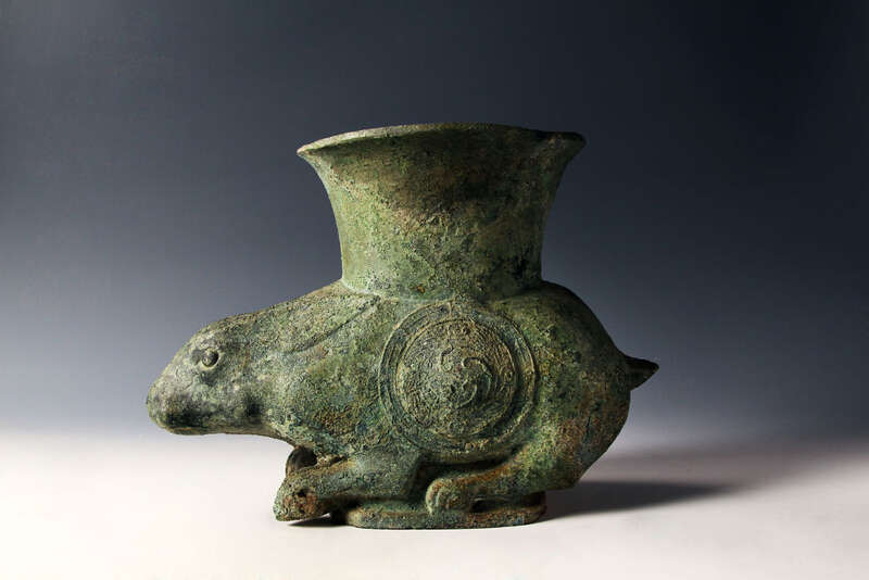 这是晋献侯墓出土的背上立喇叭形口的青铜兔尊。山西省晋国博物馆供图