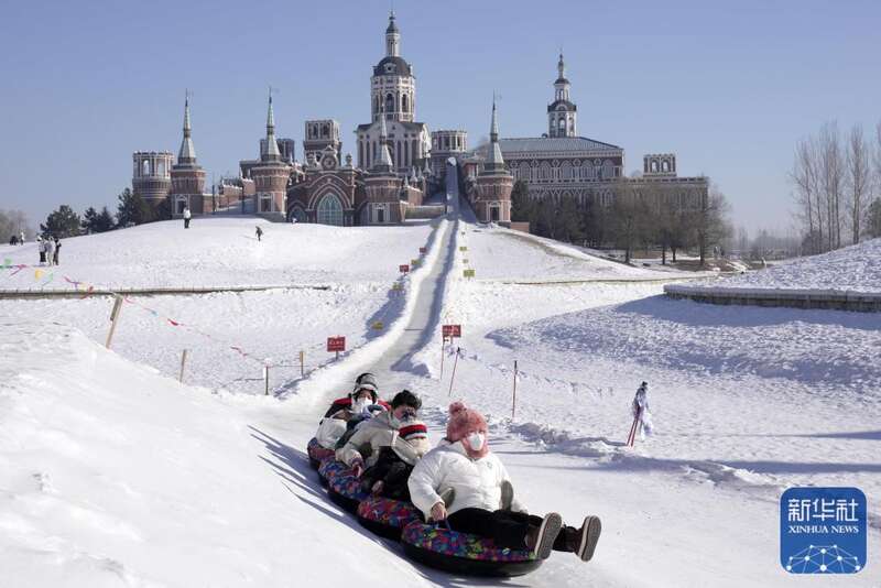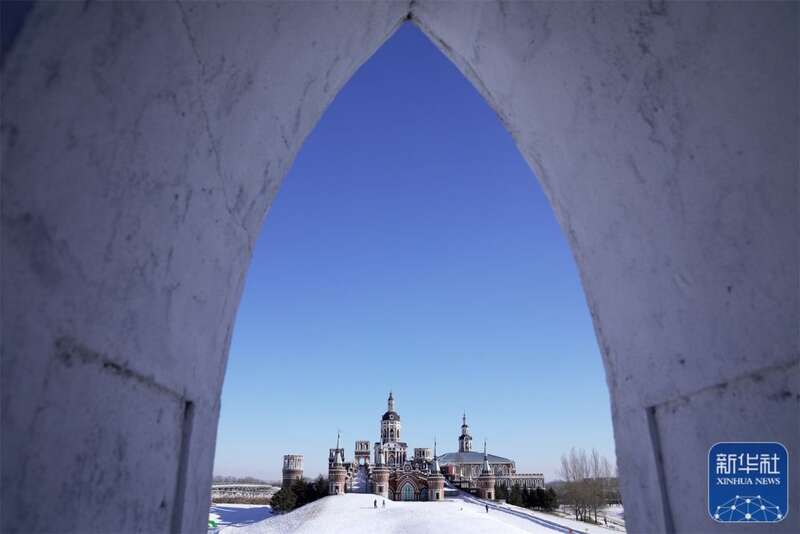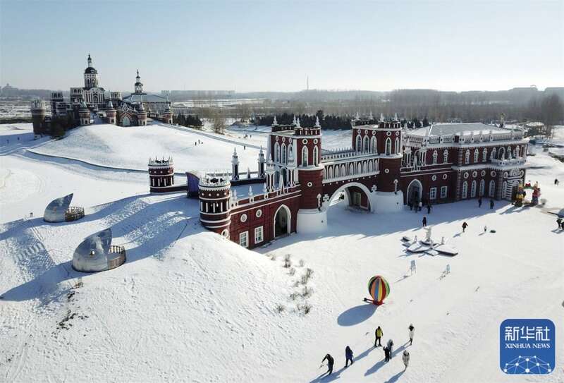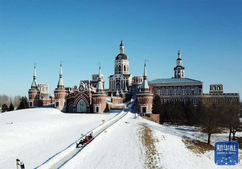 春节期间,冰城哈尔滨市的旅游景点伏尔加庄园变身冰雪世界,成为游客的旅游目的地。