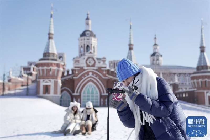 1月26日,游客在哈尔滨伏尔加庄园游玩拍照。新华社记者 王建威 摄