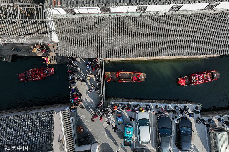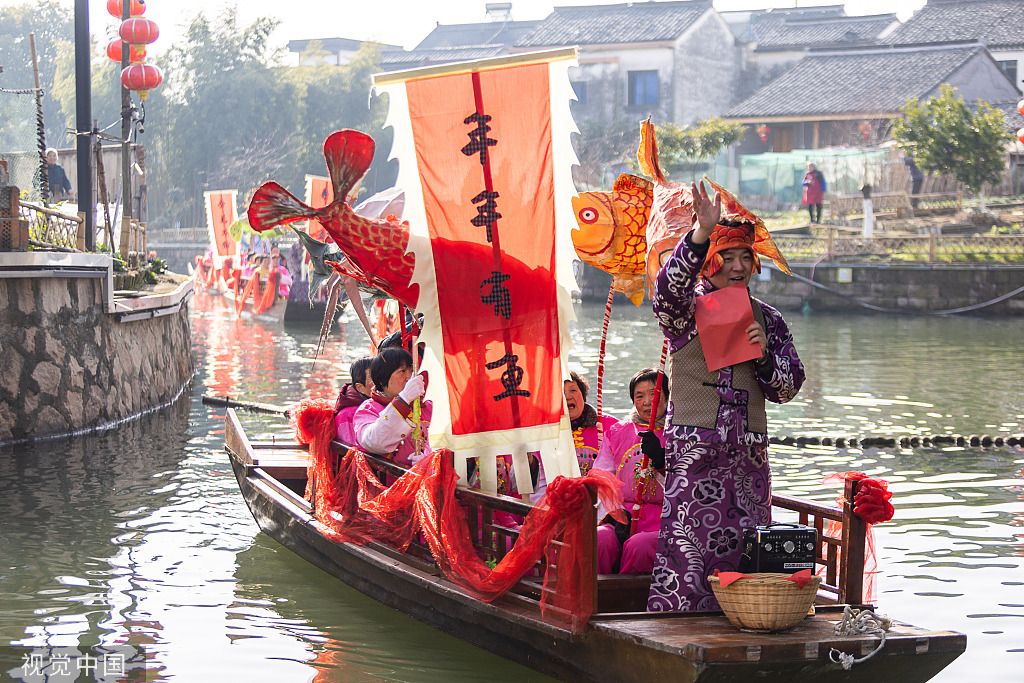 1月26日,浙江省湖州市,在南浔区荻港古镇,水乡居民和游客们水陆并举一同闹新春。