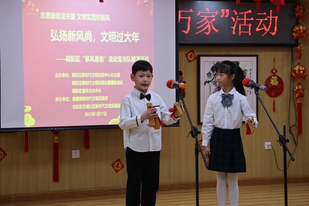 “伟大首都北京城,日新月异往前行。国泰民安多昌盛,方方面面展新容。昂首阔步齐奋斗,我们朝阳,霞光万道披彩虹……” 农历腊月二十六,循着一阵阵欢快的快板说唱声,记者来到朝阳区世纪东方城社区新时代文明实践站“党的声音进万家 弘扬新风尚,文明过大年”活动演出现场。北京市朝阳区新时代文明实践“移风易俗”流动宣传队的志愿者们,正在深入宣传党的二十大精神,将一个个倡导文明新风的原创节目送到社区群众身边,送上新春“文艺+理论”大礼包。