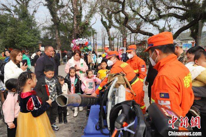 “斯蒂尔风力灭火机,主要用于扑打中低强度地表火,在扑救森林火灾过程中,它可以通过高速气流将地面蔓延的林火和可燃物分离,使空气稀释,从而使火焰熄灭……”消防指战员积极为围观民众展示灭火装备,并开展“装备初体验”系列活动,加深民众对森林防火的理解。