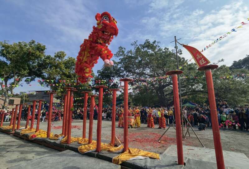 几个欢天喜地的互动节目过后,压台戏登场。由两位舞狮人扮演的雄狮纵身一跃,跳上高耸的狮桩阵。这组高桩由21个桩柱组成,桩面直径为38厘米,桩柱高在1.2米到2.5米之间,两桩之间最大跨度为1.8米。