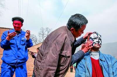 民间艺人正在给社火演员化装。冯晓伟/摄影