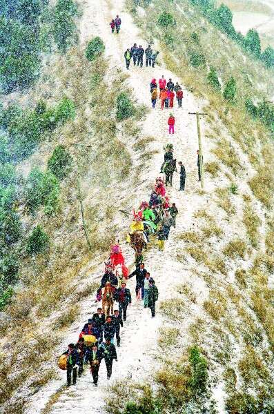 迎着风雪,行进在山脊上的马社火。冯晓伟/摄影