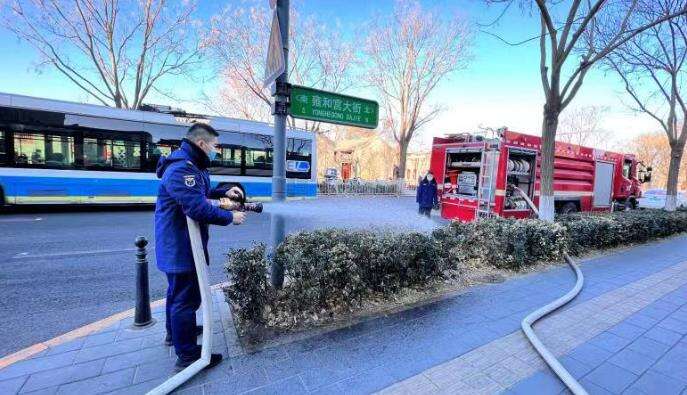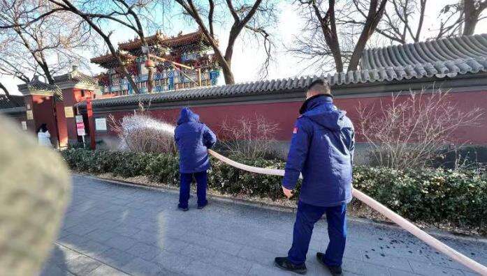 最后,消防员还对雍和宫外围进行湿化。