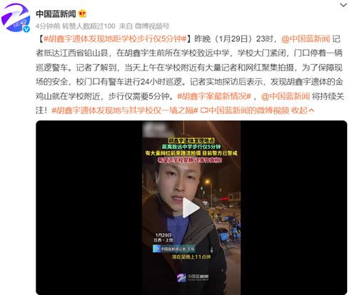 据媒体报道,学校附近有大量记者和网红聚集拍摄,为了保障现场的安全,校门口有警车进行24小时巡逻。记者实地探访后表示,发现胡鑫宇遗体的金鸡山就在学校附近,步行仅需要5分钟。