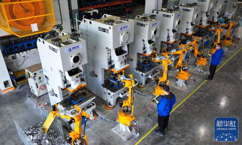 1月29日,在浙江省湖州市德清县钟管镇的浙江南泵流体机械有限公司生产车间内,工人在监测自动冲压线机械手工作情况,赶制水泵零配件(无人机照片)。新华社发(王正 摄)