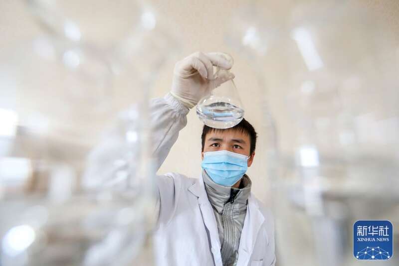 1月29日,化验员在贵州省黔东南苗族侗族自治州岑巩县工业园区一家香料厂做滴定分析。新华社发(罗慧 摄)
