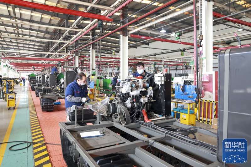 1月29日,江苏省泰州常发农业装备有限公司的工人在生产线上组装收割机。新华社发(顾继红摄)