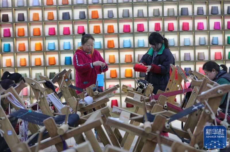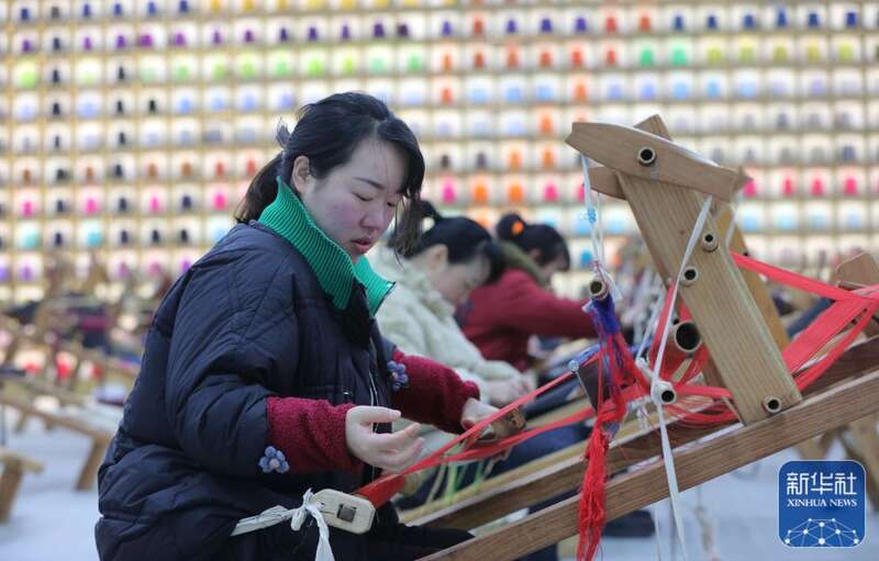 1月29日,在湖南省张家界市武陵源区乖幺妹土家族织锦生产研发基地,工人在制作土家族织锦产品。新华社发(吴勇兵 摄)