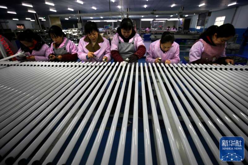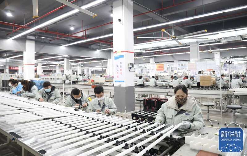 1月28日,江西省宜春市靖安县工业园区一家绿色照明企业员工在出口LED灯生产线上忙碌。新华社发(徐仲庭 摄)