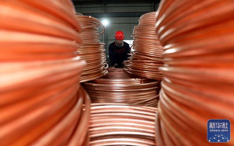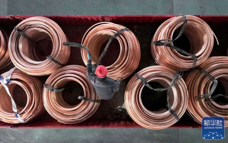 1月29日,江苏省淮安市洪泽区华胜工贸有限公司生产车间内,工人将铜杆捆绑装车(无人机照片)。新华社发(殷潮 摄)