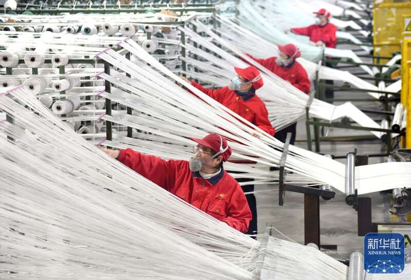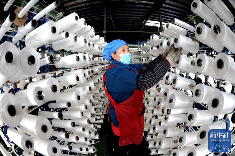 1月28日,在江苏省连云港市一家编织袋厂,工人在生产车间赶制订单产品。新华社发(王春 摄)