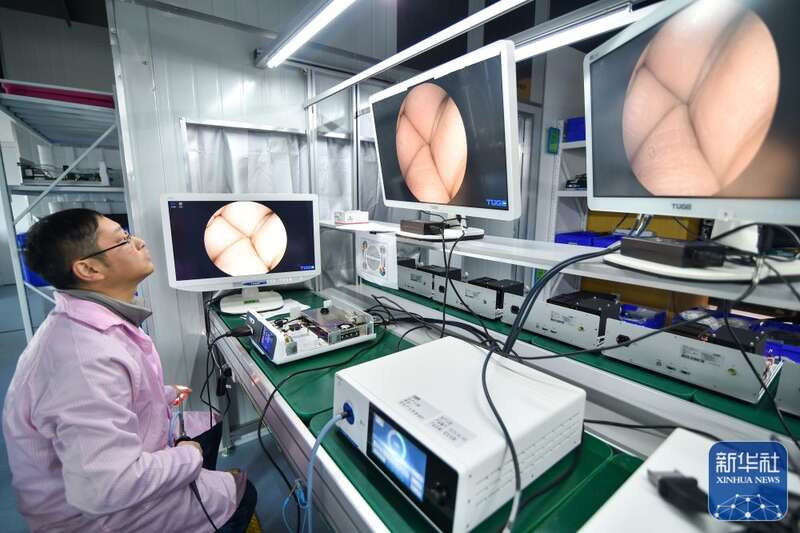 1月28日,在江苏省南京市麒麟科技创新园的一家医疗科技有限公司,工人在检测内窥镜摄像系统。新华社发(方东旭 摄)