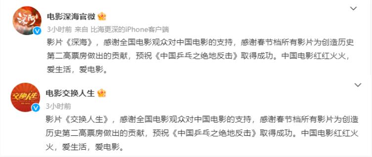 2月1日,春节档6部电影《流浪地球2》《满江红》《无名》《深海》《交换人生》《熊出没·伴我“熊芯”》在官微联合感谢全国电影观众对中国电影的支持。今年春节档电影市场斩获近68亿票房,6部影片创造了历史第二高春节档的好成绩。